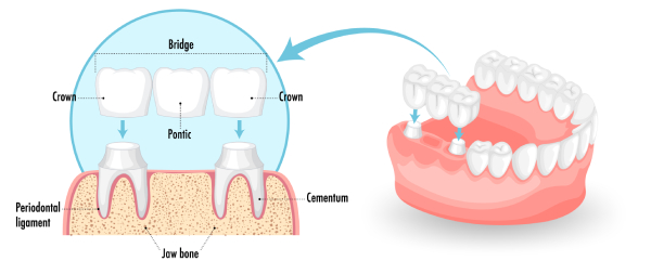 A dental bridge is used to replace one or more missing teeth by anchoring artificial teeth (pontics) to the natural teeth or implants on either side.